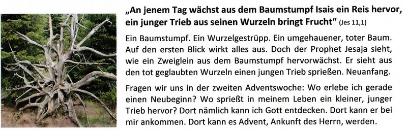 Vor zehn Jahren, am 24. Mai 2015, hat Papst Franziskus die Enzyklika „Laudatosi“ veröffentlicht. In diesem Lehrschreiben hat der Argentinier die Umwelt, die Schöpfung, die Natur in den Blick genommen. Er schreibt dabei von seiner „Sorge um das gemeinsame Haus“. Davon inspiriert werden auch wir heuer im Advent unseren Blick auf die Schöpfung lenken und gemeinsam mit dem Sachausschuss Liturgie in der Natur Adventsbegleiter entdecken. Dabei hilft uns auch jeden Sonntag das vorgesehene Evangelium. Denn darin lässt sich aus der Pflanzenwelt jeweils ein Wegweiser hin zum Weihnachtsfest entdecken…